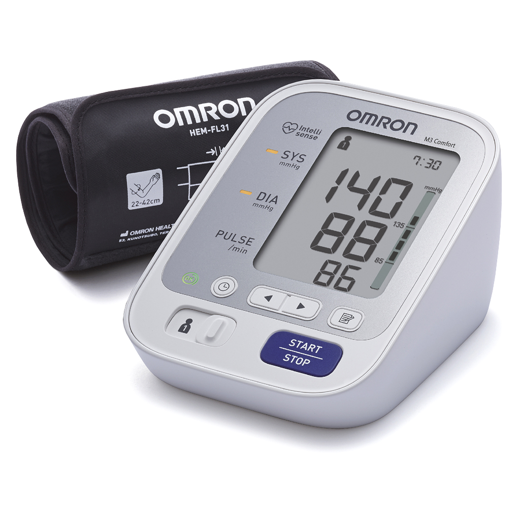 M3 Comfort – cu funcțiile specifice tensiometrelor Omron M7 Intelli IT și M 6 Comfort N, tensiometrul de braț complet automat M3 Comfort are o funcție de calcul a ultimelor trei măsurători și o capacitate de memorie de 60 de determinări cu ora și data efectuării lor, pentru două persoane diferite.