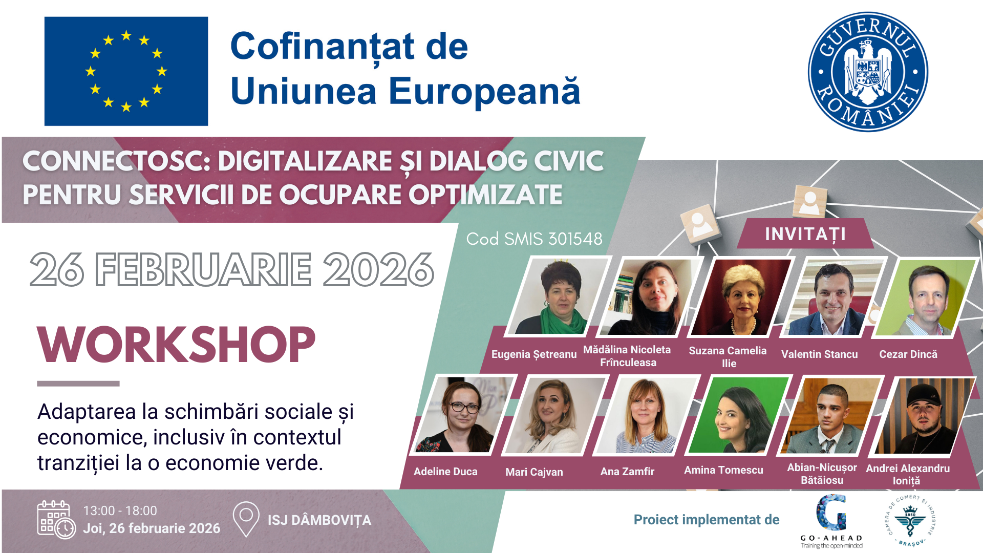 Asociația GO-AHEAD organizează în data de 26 februarie 2026, la sediul Inspectoratul Școlar Județean Dâmbovița, workshopul „Adaptarea la schimbări sociale și economice, inclusiv în contextul tranziției la o economie verde”, un eveniment dedicat organizațiilor din grupul țintă, precum și altor entități active pe piața muncii sau în domeniul serviciilor sociale – reprezentanți guvernamentali, agenți economici și ONG-uri.