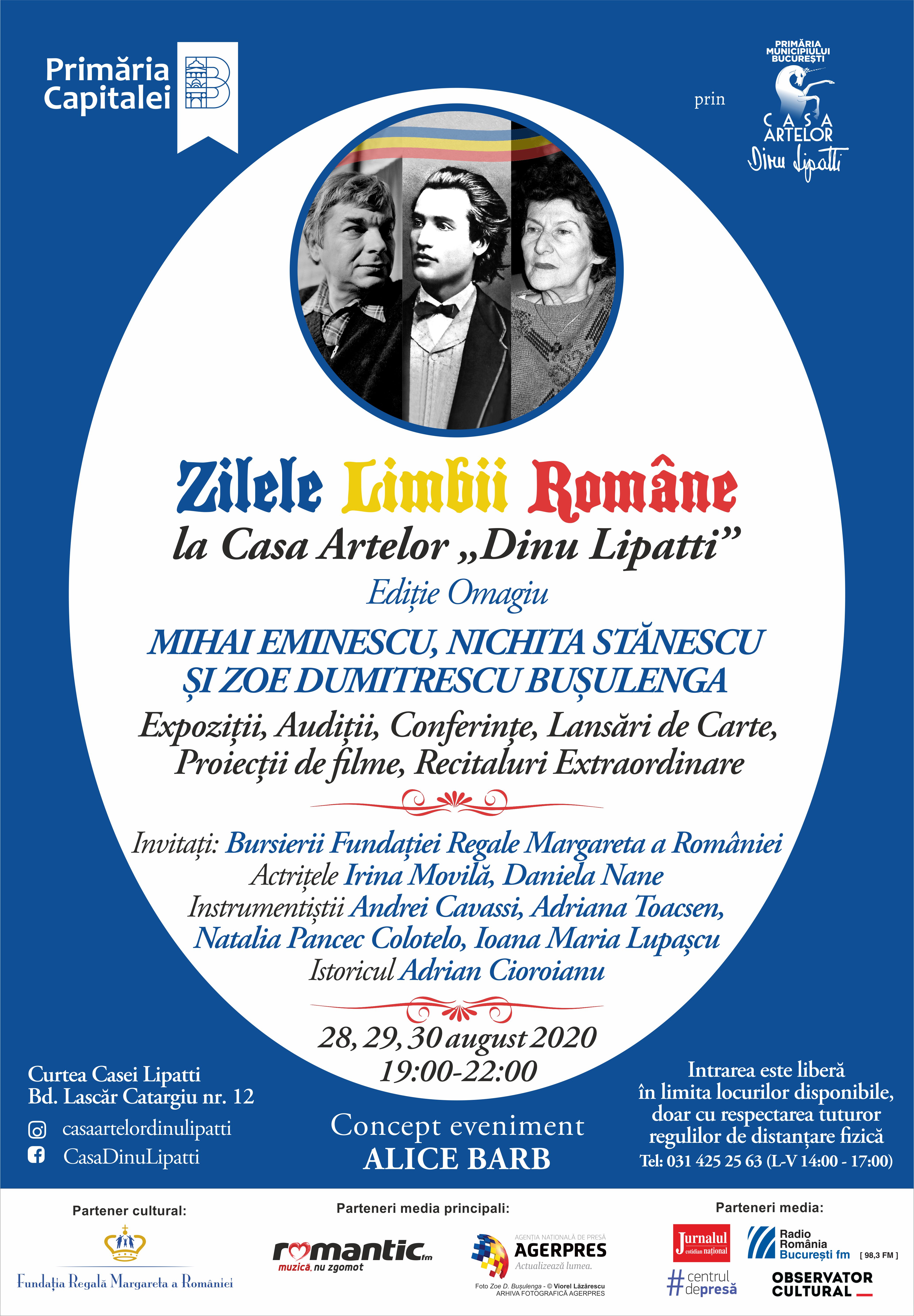 Primăria Municipiului București prin Casa Artelor „Dinu Lipatti” organizează „Zilele Limbii Române – Ediție Omagiu – Mihai Eminescu, Nichita Stănescu și Zoe Dumitrescu-Bușulenga”, vineri, sâmbătă și duminică – 28, 29 și 30 august 2020, între orele 19:00 și 22:00, în Curtea cu balansoare a Casei Lipatti.