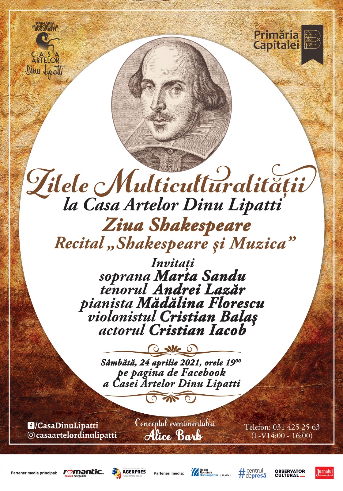 Casa Artelor Dinu Lipatti este Centrul Cultural al Capitalei dedicat Artelor clasice, iar „Ziua Shakespeare” este un bun prilej de a celebra frumusețea și genialitatea creației pe care a lăsat-o lumii unul dintre cei mai mari scriitori ai umanității. William Shakespeare a fost poet, dramaturg și actor englez și, deși nu este cunoscută cu exactitate data nașterii, aceasta este atribuită zilei de 23 aprilie din anul 1564. Este numit poetul național al Angliei, opera sa vastă a fost tradusă în aproape toate limbile vorbite, iar piesele sale sunt jucate mai des decât cele ale oricărui alt dramaturg în întreaga lume.