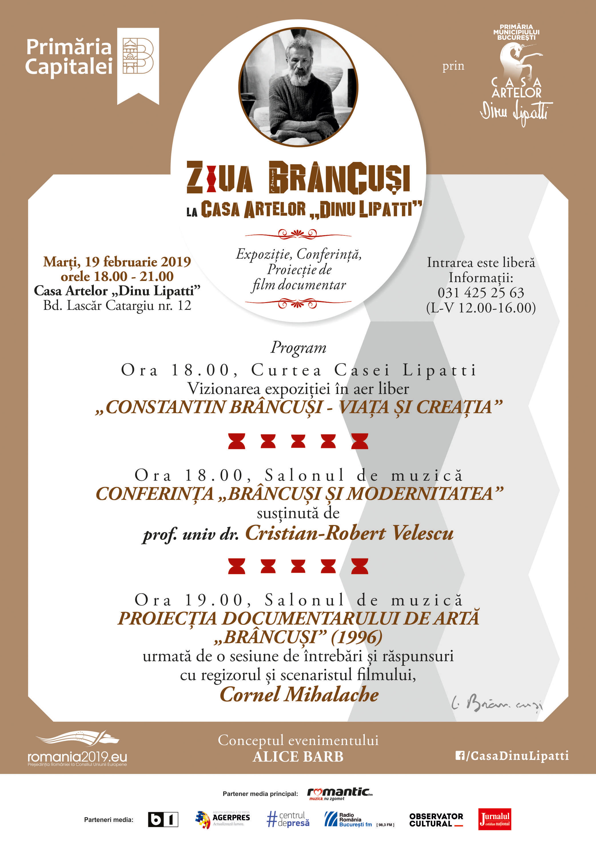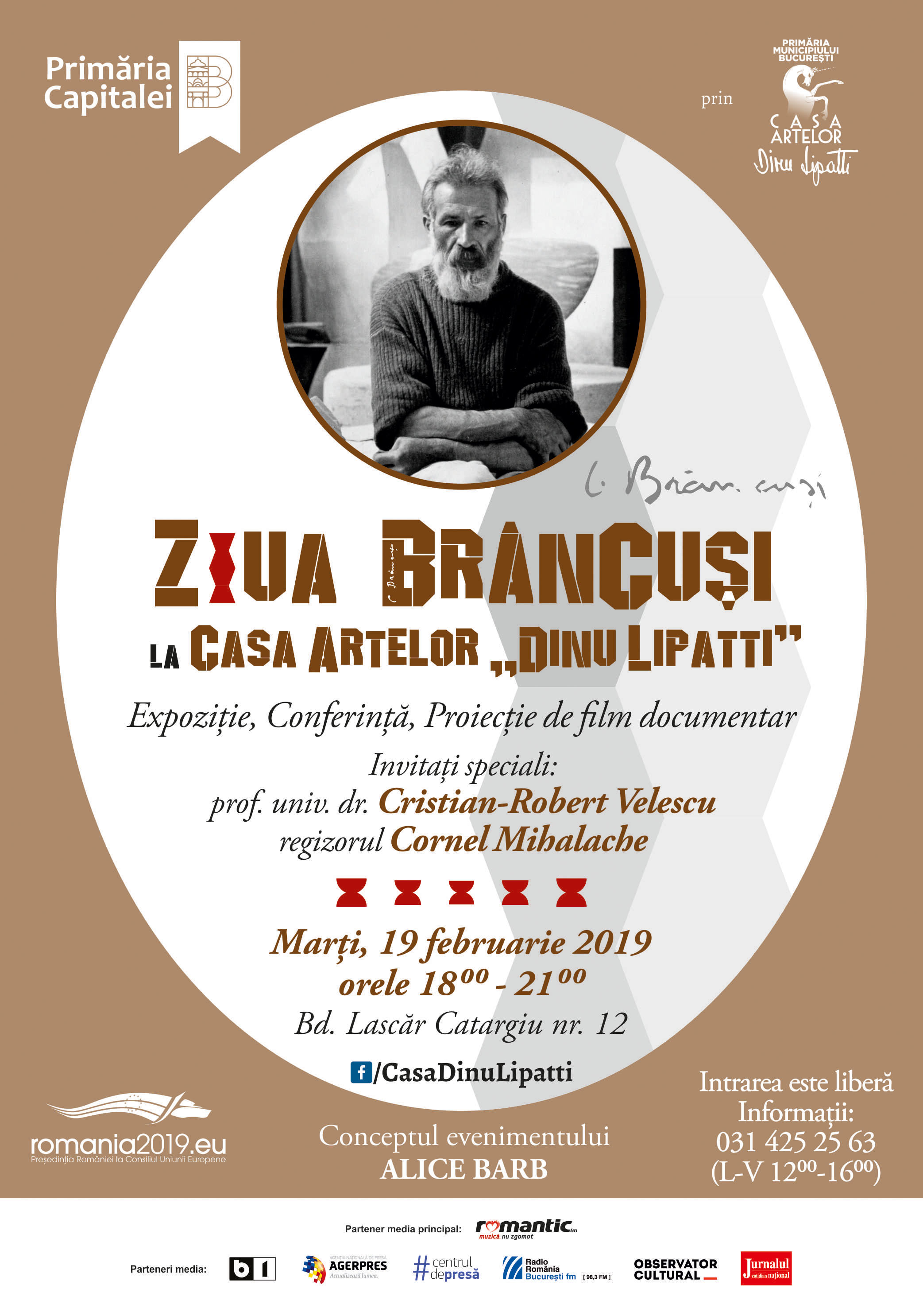 Primăria Municipiului București prin Casa Artelor „Dinu Lipatti” vă invită marți, 19 februarie 2019, de la orele 18.00, la evenimentul ZIUA BRÂNCUȘI LA CASA ARTELOR „DINU LIPATTI”, organizat ca omagiu pentru genialul sculptor român, Constantin Brâncuși.