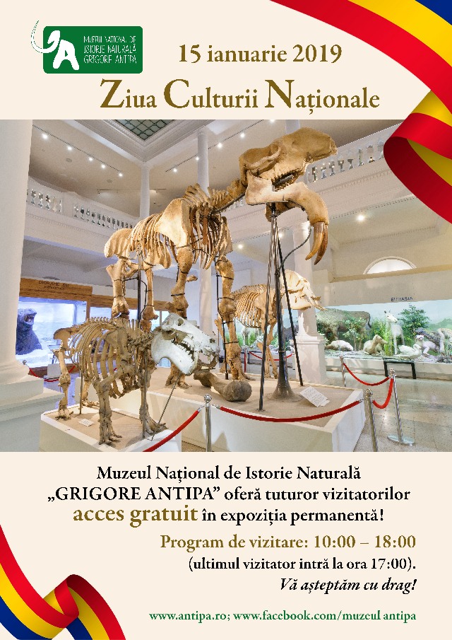 Muzeul Național de Istorie Naturală „Grigore Antipa” oferă acces gratuit în expunerea permanentă tuturor vizitatorilor marți, 15 ianuarie 2019, cu prilejul Zilei Culturii Naționale.