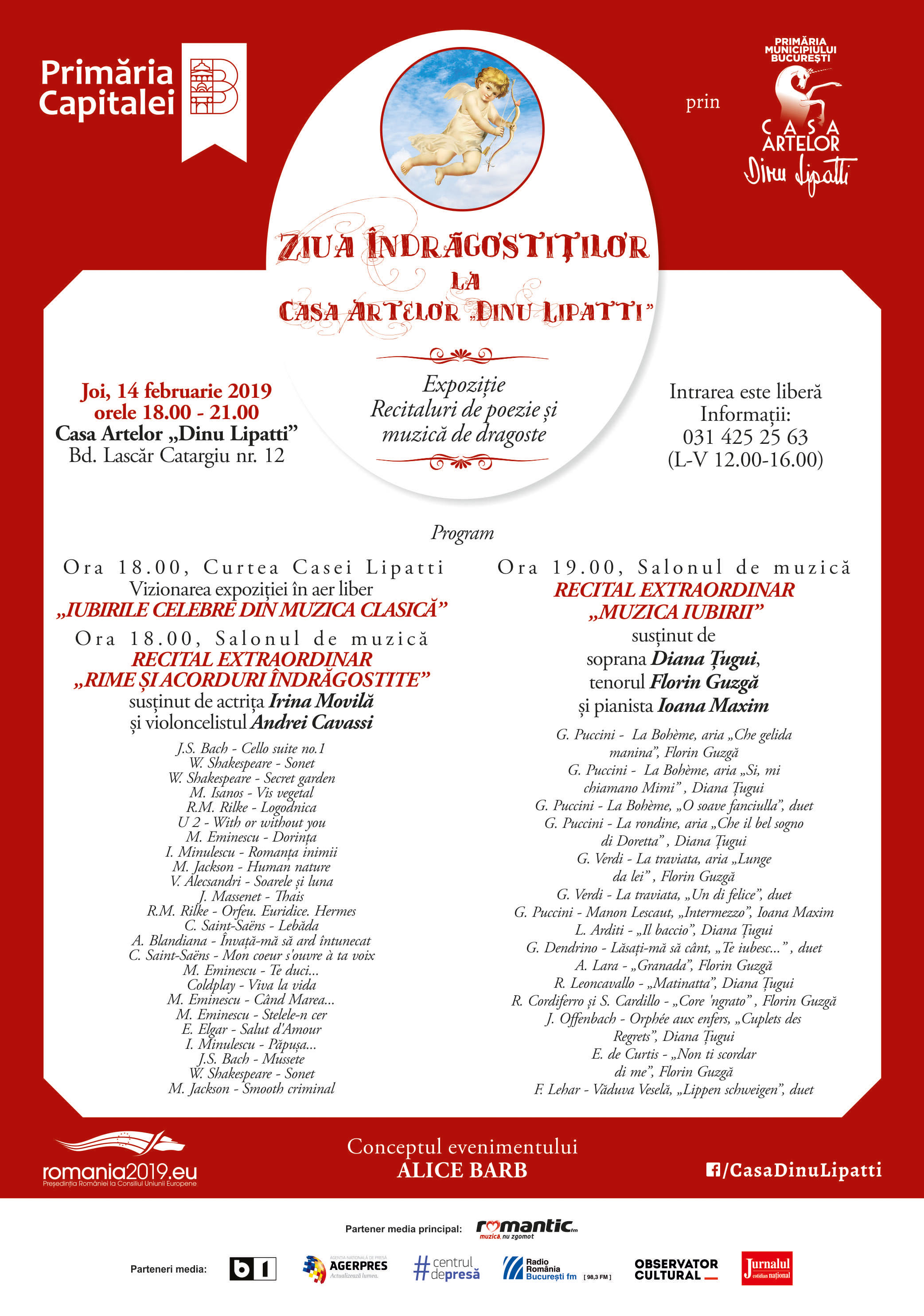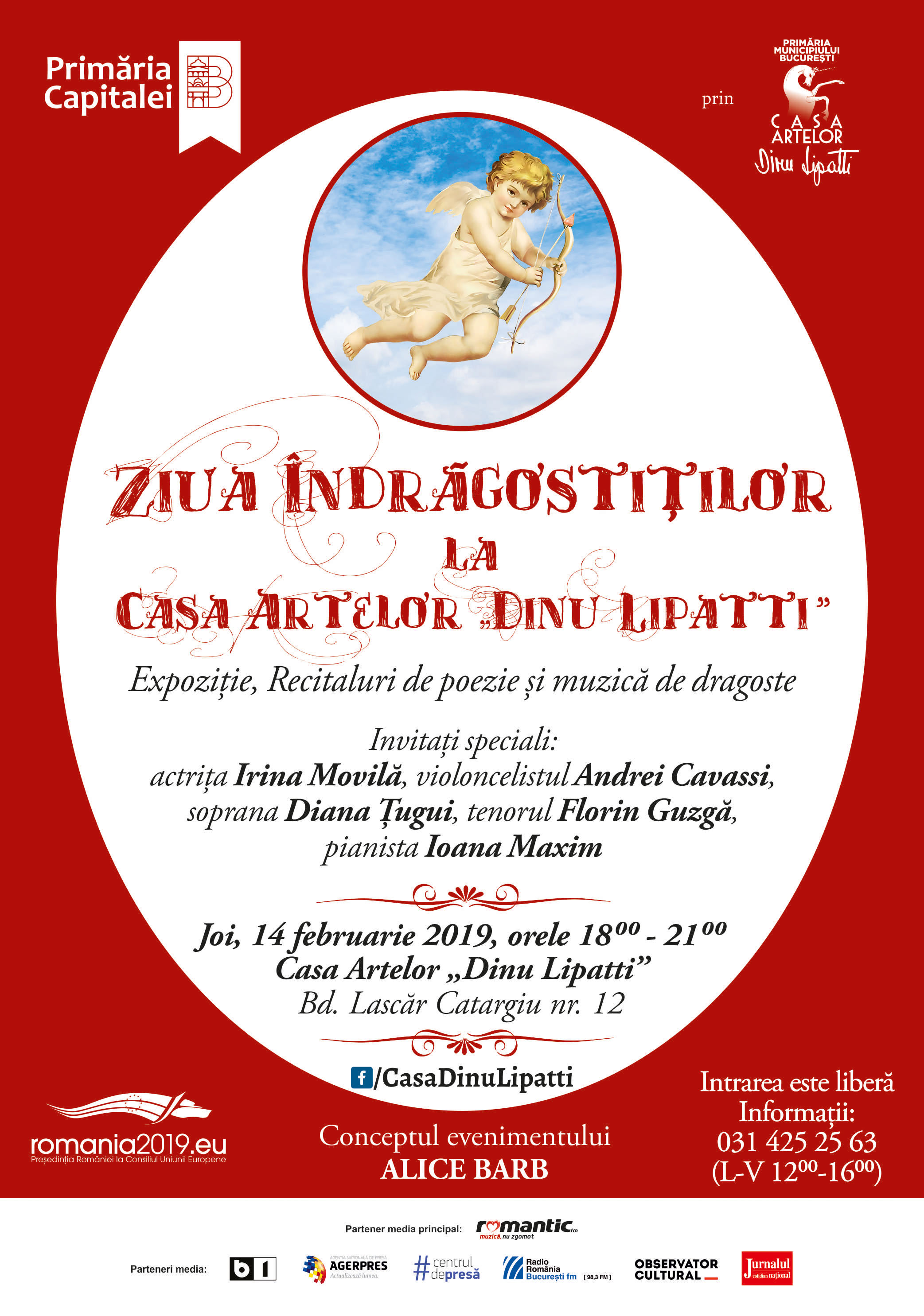 Primăria Municipiului București prin Casa Artelor „Dinu Lipatti” vă invită joi, 14 februarie 2019, de la orele 18.00, la evenimentul ZIUA ÎNDRĂGOSTIȚILOR LA CASA ARTELOR “DINU LIPATTI”, prilejluit de sărbătoarea Sfantului Valentin și a iubirii.