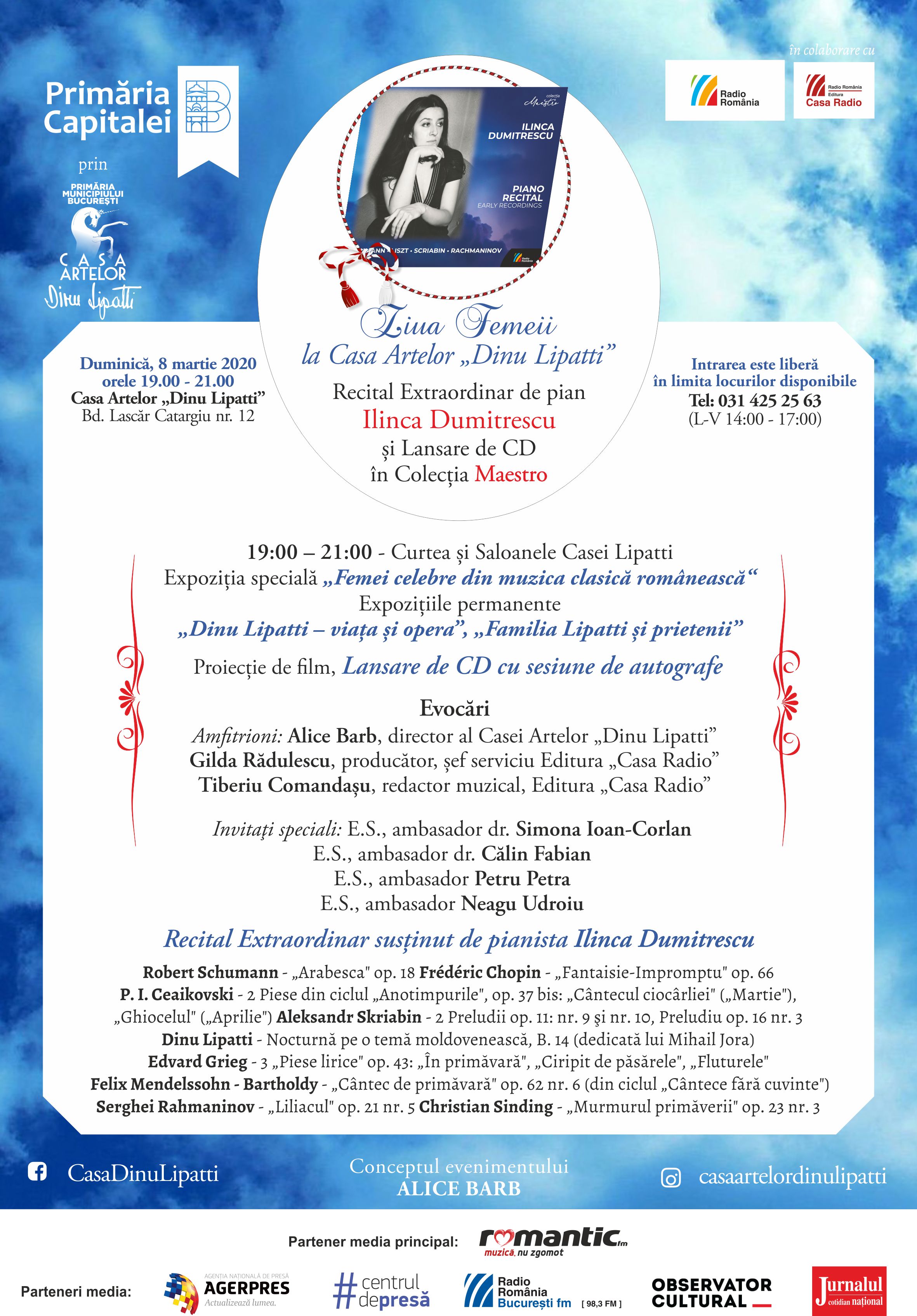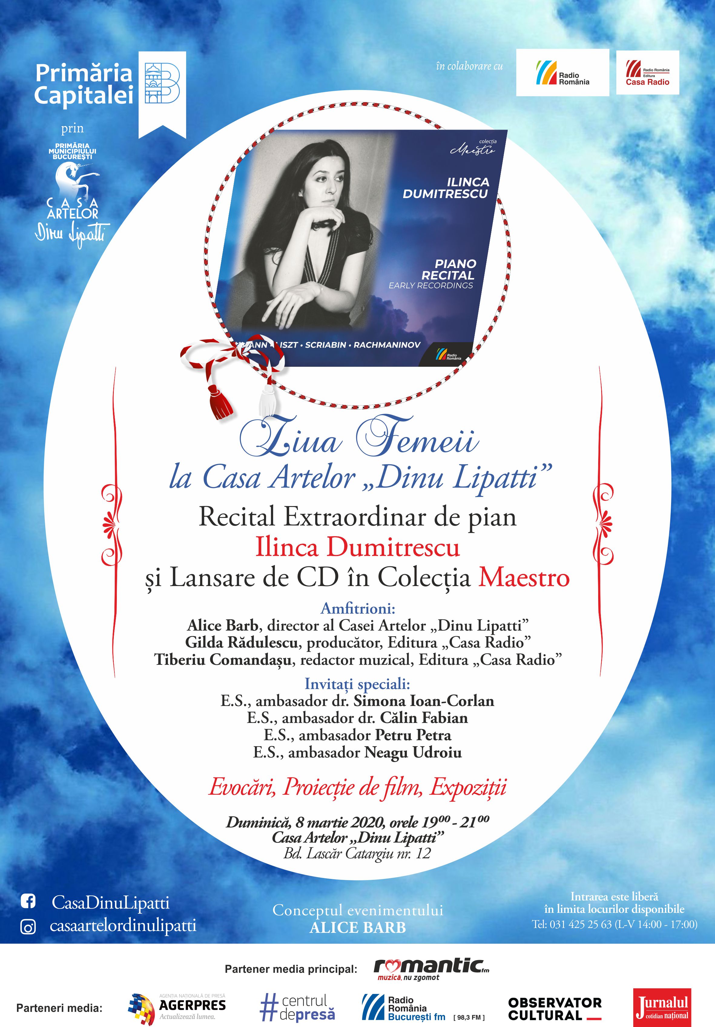 De Ziua Internațională a Femeii, Primăria Municipiului București prin Casa Artelor „Dinu Lipatti”, în colaborare cu Radio România și Editura Casa Radio vă invită, duminică 8 martie 2020 începând cu orele 19:00, să sărbătorim grația, eleganța și performanța feminină din Arta românească printr-un eveniment muzical de excepție, lansarea Albumului „Ilinca Dumitrescu – Recital de pian”, în Colecția „Maestro”, urmată de un Recital extraordinar.