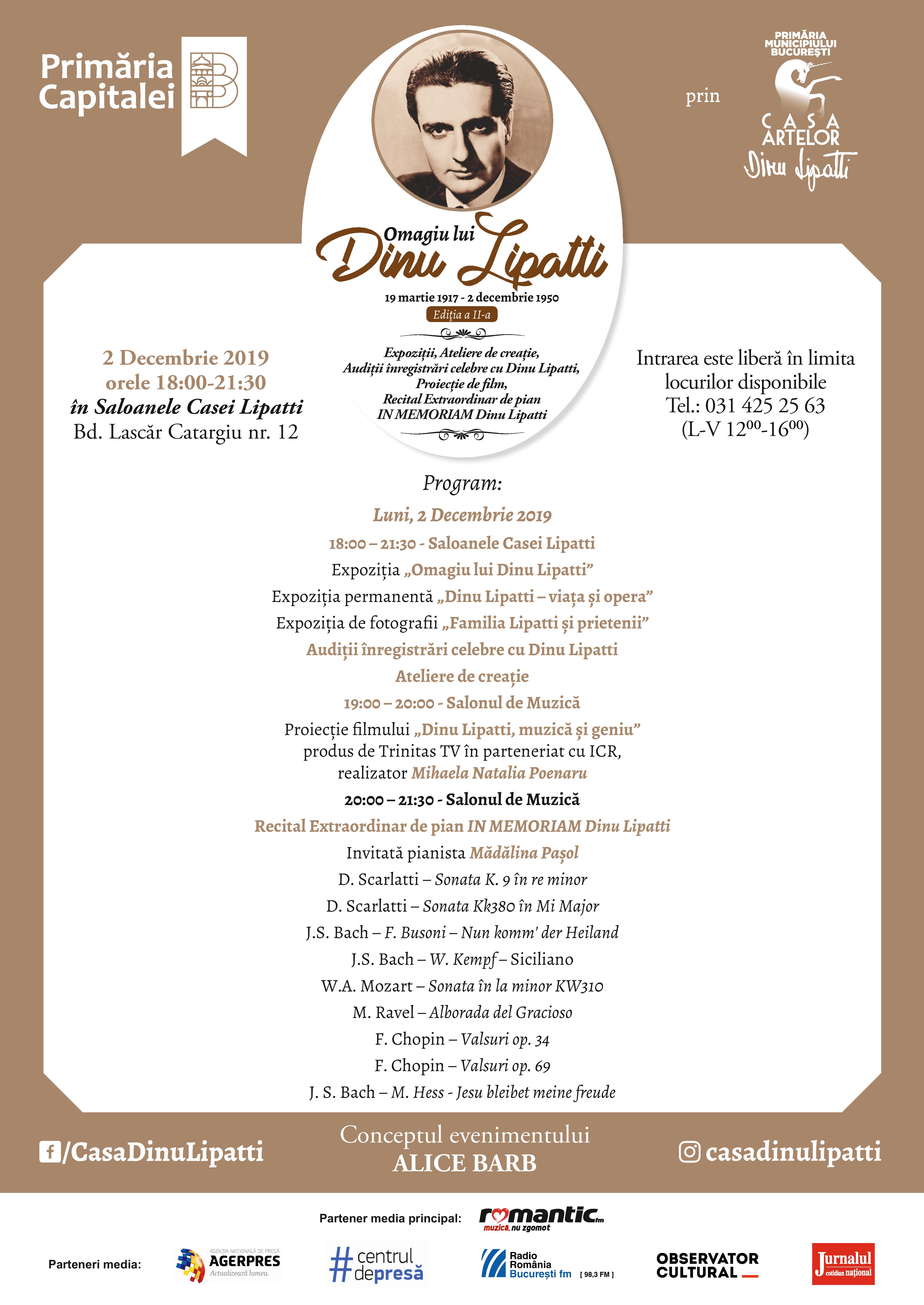 Primăria Municipiului București prin Casa Artelor „Dinu Lipatti” vă invită, luni 2 decembrie 2019, între orele 18:00-21:30, la evenimentul „Omagiu lui Dinu Lipatti”, Ediția a II-a, pentru a marca 69 de ani de la trecerea în eternitate a marelui pianist și compozitor român.